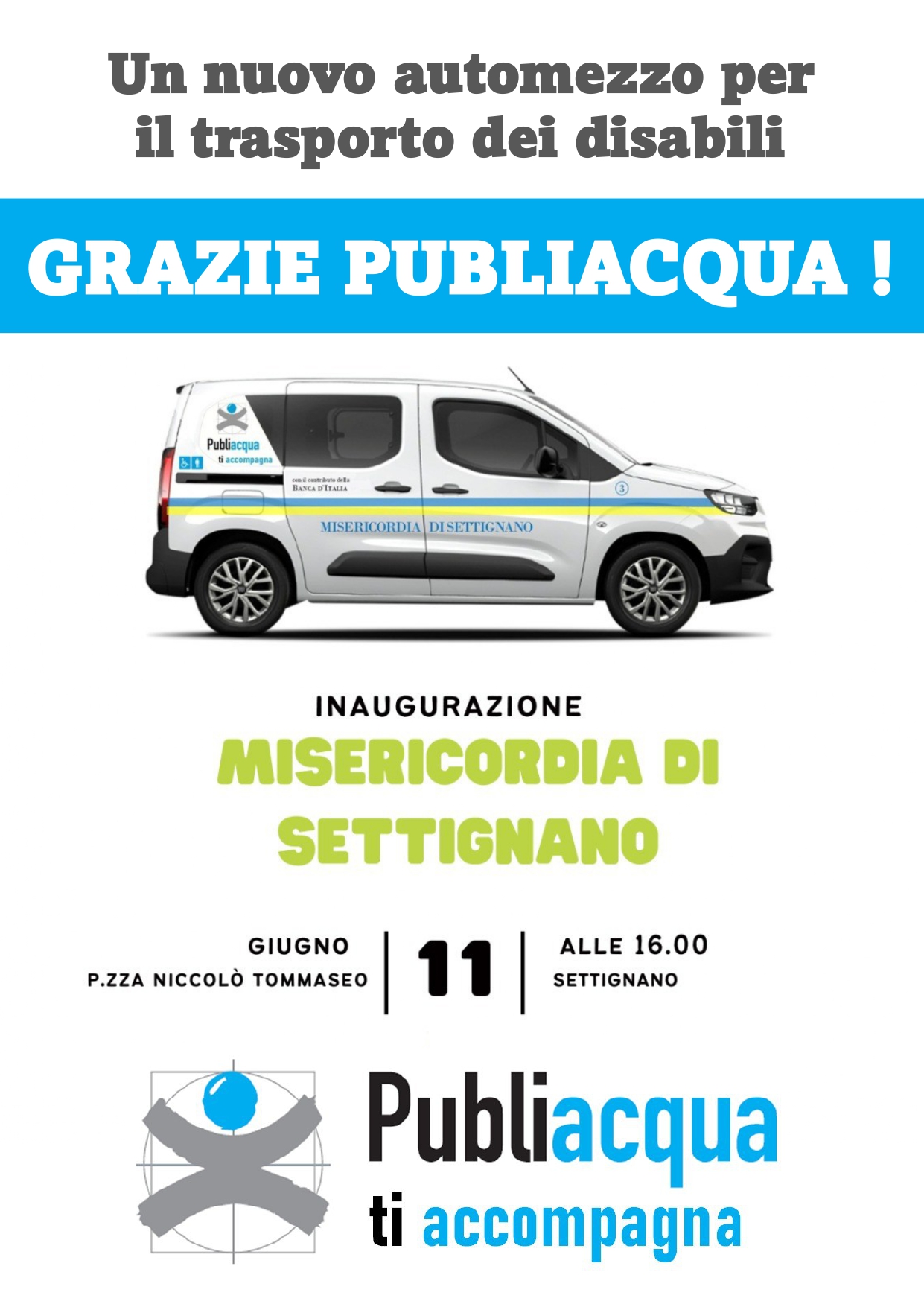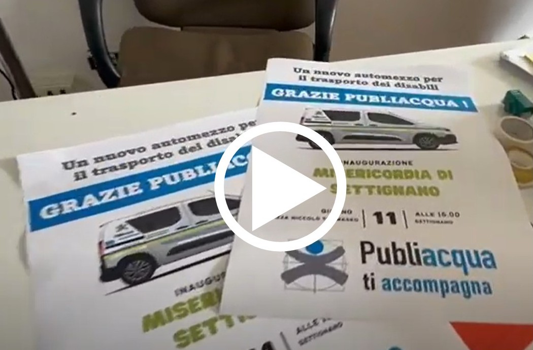 A seguito del bando "I-Care" a cui ha partecipato la nostra Misericordia, Publiacqua SpA ha stanziato un contributo di 6.500 € finalizzato a sponsorizzare l'Azienda con le nostre attività di trasporto di soggetti disabili, quando sarà acquistato il nuovo mezzo attrezzato per il trasporto di persone in carrozzina.